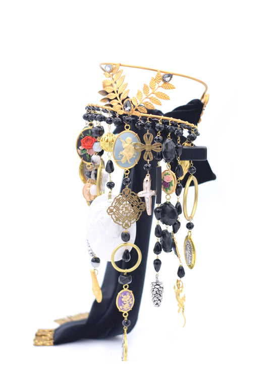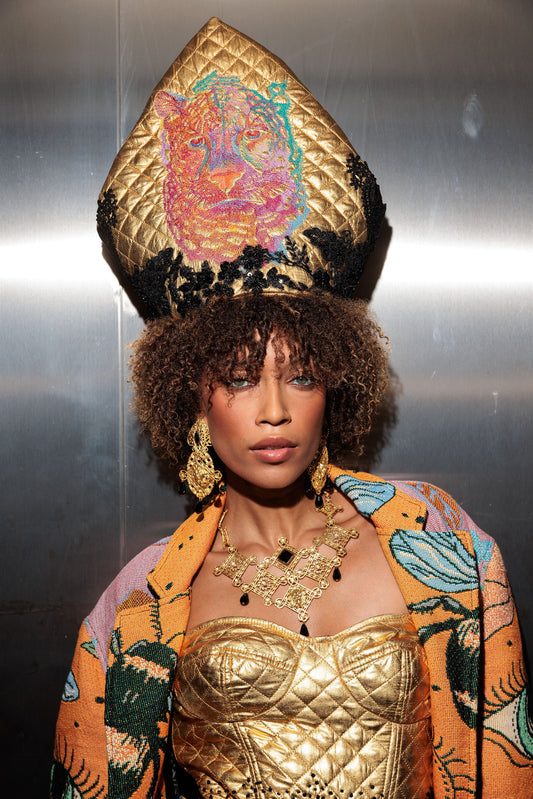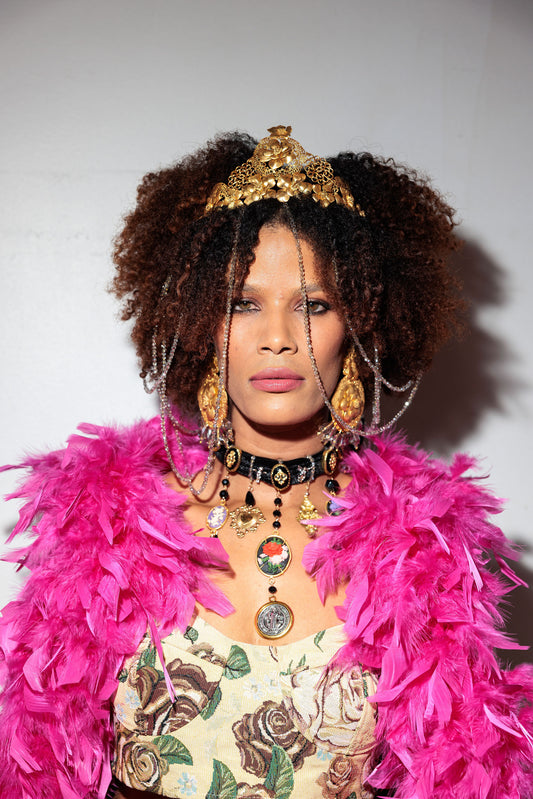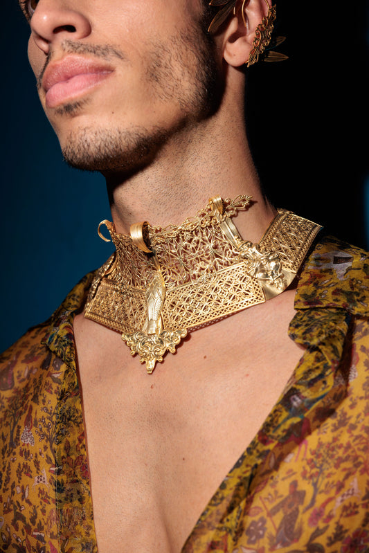 No nosso atelier desenhamos coroas, tiaras, toucados, bandoletes, brincos, pulseiras de mão e braço, pulseiras tradicionais, anéis, tops, saias, casacos... Tudo! Desenhamos e produzimos cada peça à sua medida.