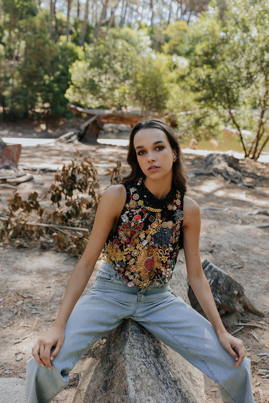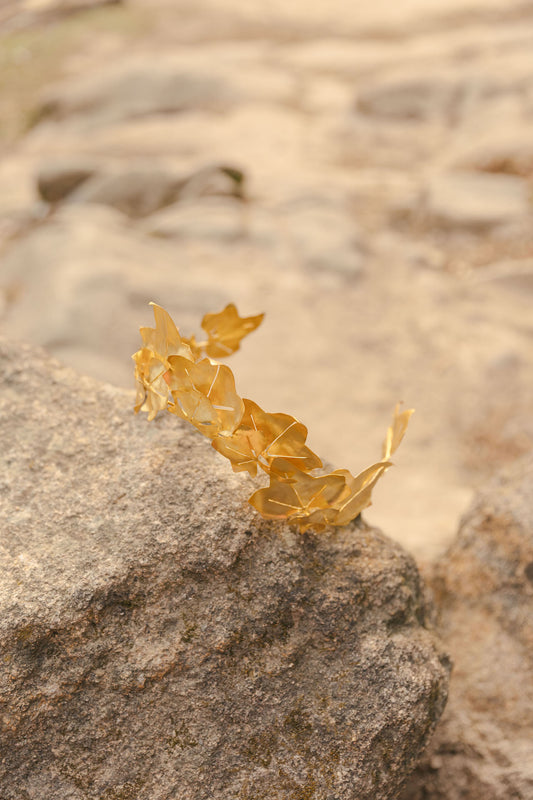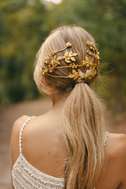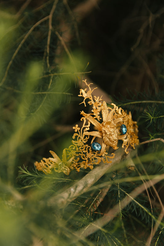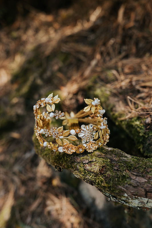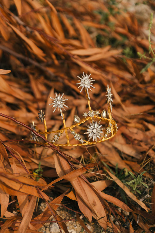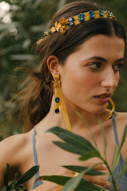 No nosso atelier desenhamos coroas, tiaras, toucados, bandoletes, brincos, pulseiras de mão e braço, pulseiras tradicionais, anéis, tops, saias, casacos... Tudo! Desenhamos e produzimos cada peça à sua medida.