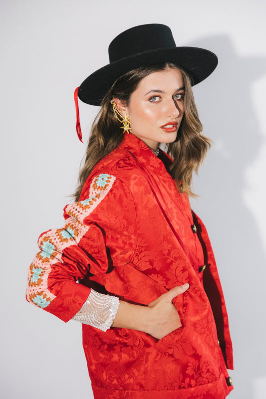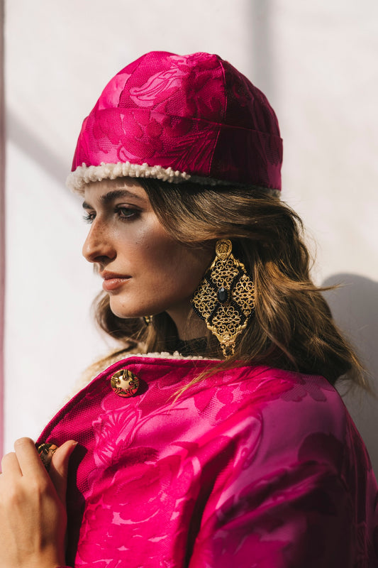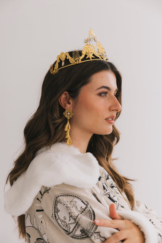 In our studio we design crowns, tiaras, headdresses, headbands, earrings, hand and arm bracelets, traditional bracelets, rings, tops, skirts, coats... Everything! We design and produce each piece to your specifications.