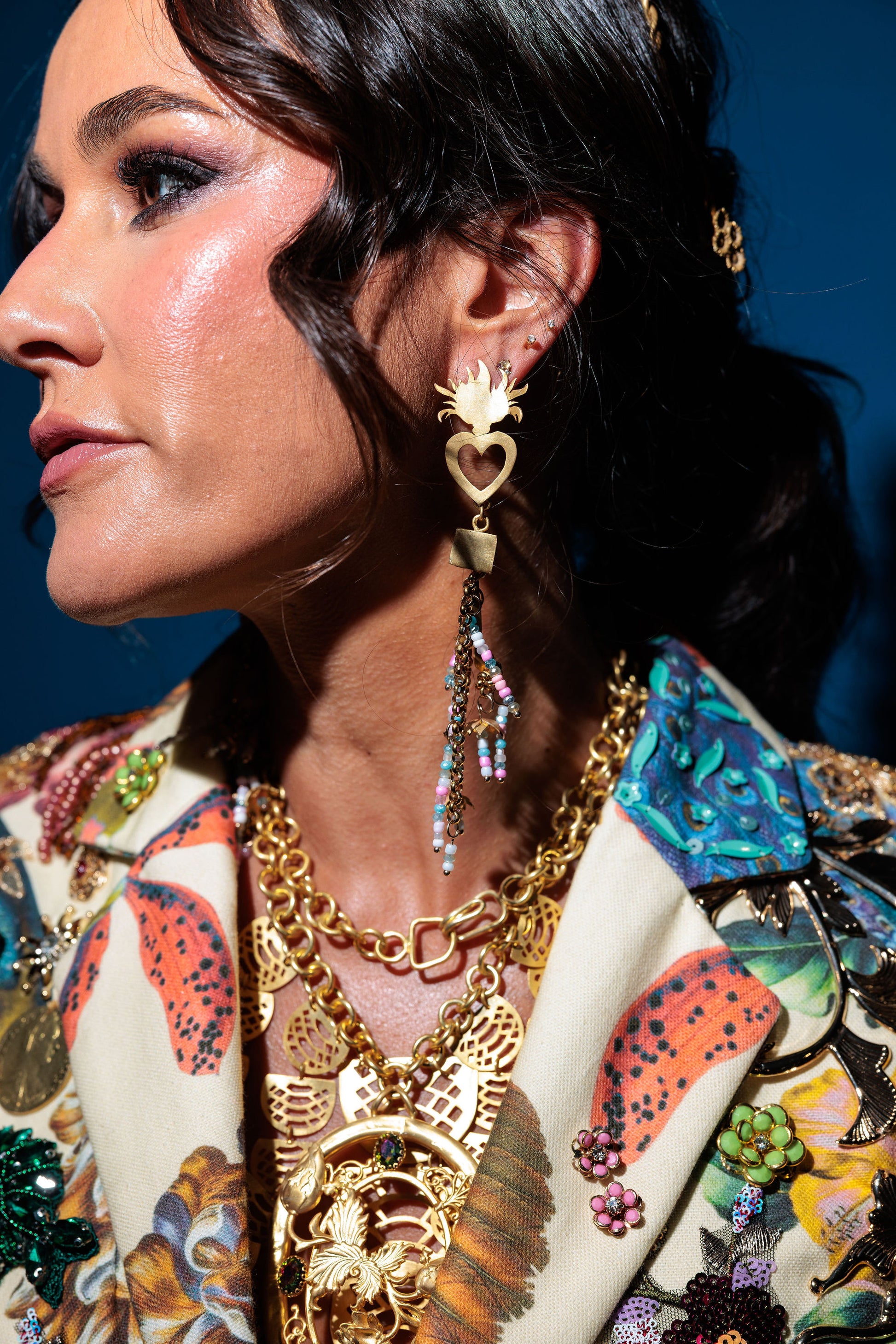 Our earrings are made of brass, gold plated and are sold as a pair. The earring does not hold through holes.
